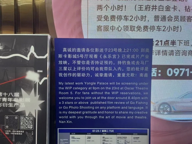 在产业放映的影城的门口,南鑫竖起了一块牌子,“持《钓鱼》或《去马厂》三星以上评价均可由我带队入内,您的批评是创作的驱动力。”虽不知“三星以上评价”与“您的批评”之间是否存在某种冲突关系,但客观上它的确加大了产业放映板块的关注度。