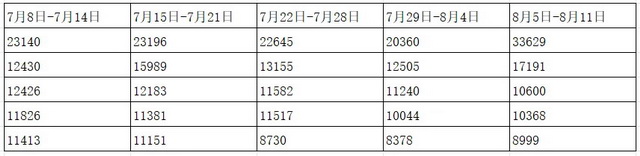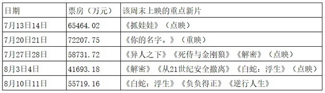 先从电影市场来看,今年的奥运会在7月27日到8月12日之间,开始与结束都正好在两个周末。而周末也是一周中电影市场的高潮,不妨以几个周末的大盘数据做一个简单对比。