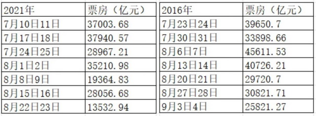 再打开2021年和2016年的历史记录,将奥运开始前两周周末与结束后两周周末的数据一并观察,不难发现并不存在奥运期间对电影票房造成影响的情况。两年之中都基本遵循暑期档越接近尾声票房越低的大体规律,2016年奥运会期间,电影市场甚至还迎来了一段票房的小高峰。