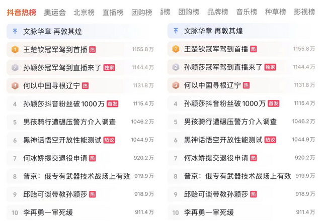 抖音为奥运制作了专门的界面,打出“上抖音看奥运”的标语,同时也推出了自制节目《冠军驾到》,邀请过去曾夺冠的前国手们进行访谈。在抖音热榜的界面中,主榜的旁边是单独的“奥运会”榜单,要再往后数七个榜单,才轮到“影视榜”。