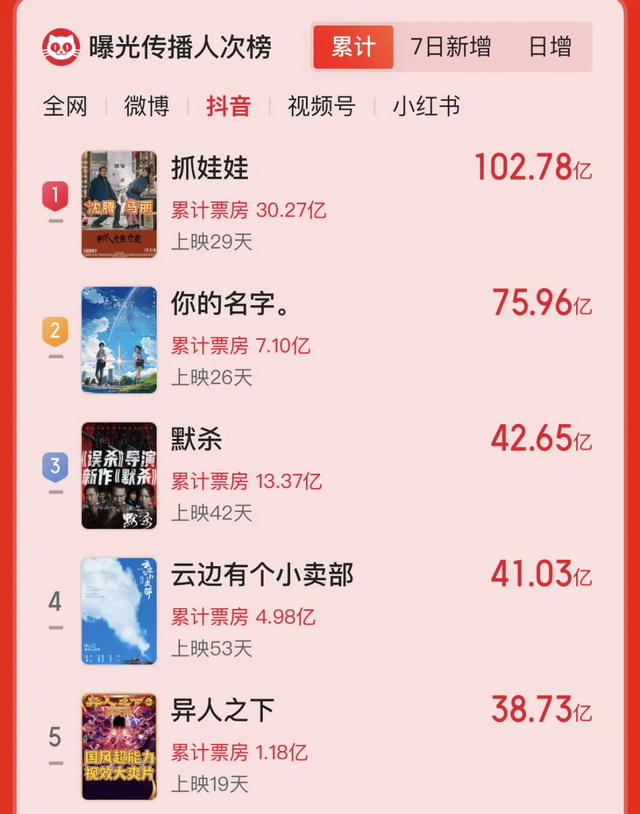 据猫眼专业版统计的暑期档曝光传播人次榜,排名前十的影片整个暑期在抖音合计收获了423.66亿人次传播,而点开抖音“巴黎奥运会”话题,单个话题的播放量便已经突破了1004.4亿,二者的曝光量级完全不在一个层次上。