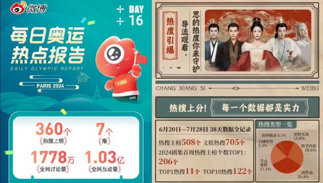 新浪体育微博总结了每日奥运热点,在一共16个比赛日中,每天上榜的奥运相关热搜在280个到370个之间。作为对比,暑期档头部剧集《长相思第二季》播出38天的时间里,登上热搜主榜的数量仅有508个,文娱榜的数量705个,合计平均一天也只有32个热搜,约有十倍的差距。这还仅仅只是数量的差距,奥运头部热搜后面常会跟上一个“爆”字。