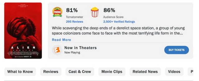 在系列内部,《异形:夺命舰》的成绩足以排到次席,仅低于2012年亮相的《普罗米修斯》,后者首映曾进账5105万美元。而在上世纪出炉的作品中,首周末都落在2千万美元以下,但彼时的院线放映周期远长于当下,且未考虑数十年来的通货膨胀因素。若以R级的维度视之,《异形:夺命舰》在今年则高居前三甲,只有《死侍与金刚狼》(2.11亿美元)和《绝地战警:生死与共》(5653万美元)的开局更佳。