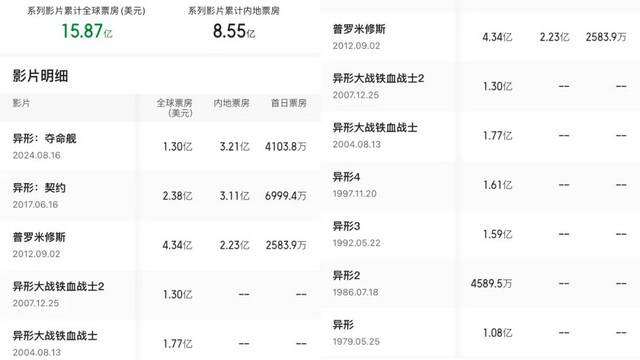 随着《异形:夺命舰》再度飘红,这一科幻恐怖系列的票房胜绩还在延续。