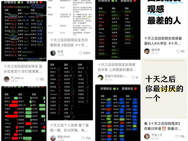 在这种情况下,人设翻车的情况变得愈发明显。《十天》里,每个嘉宾前期都努力贴合自己的身份标签,但是随着极端情境加剧,他们标签之外的性格特征也表露了出来,冲击了观众对其单一性认知。小红书上,网友们根据嘉宾的表现,纷纷制作出“红黑榜”,评判对每位嘉宾的印象转变。