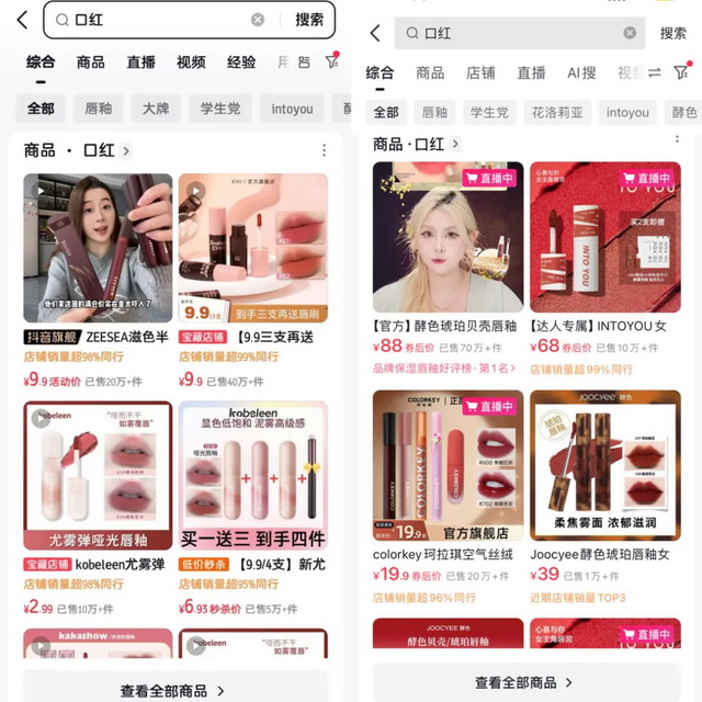 以“口红”为关键词进行搜索 左:抖音搜索 右:抖音