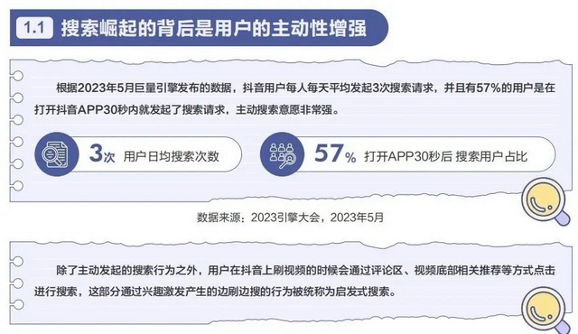 从用户层面来看,抖音用户有着非常强烈的搜索欲望。2023年巨量引擎数据显示,抖音用户每人每天平均发起3次搜索请求,并且有57%的用户是在打开抖音APP的30秒内就发起了搜索请求。