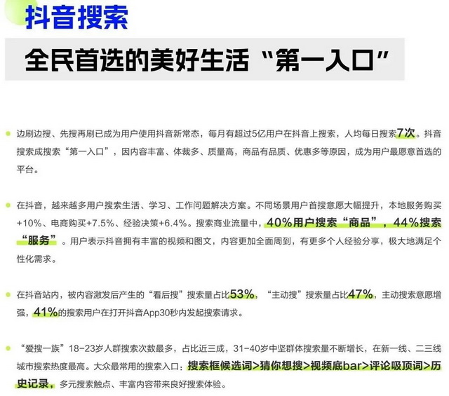而据《2024年巨量引擎搜索广告营销通案数据》显示,抖音用户每人每天平均发起7次搜索请求,这相比去年的3次,增长不可谓不迅速。