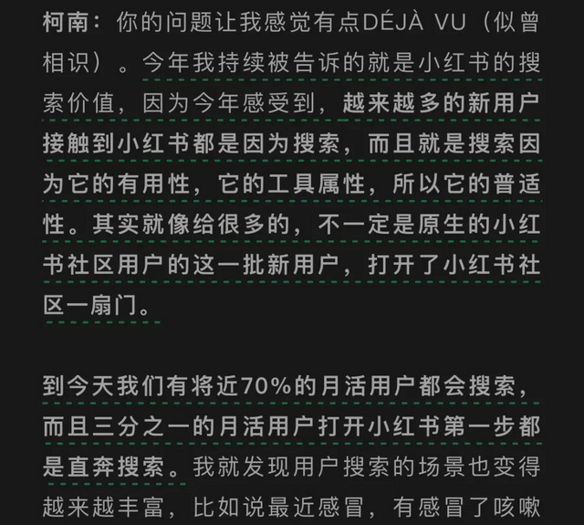 小红书的搜索用户也非常庞大。小红书COO柯南在曾在2023年底访谈中透露,将近70%的小红书月活用户都会搜索,且有三分之一的月活用户,打开软件的第一步就是直奔搜索。