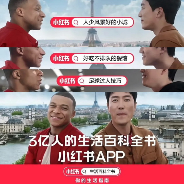 在刚刚过去的巴黎奥运期间,小红书特意找来姆巴佩和刘翔拍摄宣传片,以刘翔提问“人少风景好的小城上哪搜?好吃不排队的餐馆上哪搜?足球过人技巧上哪搜”的方式带出“小红书——生活的百科全书”的主题,狠狠打了一波用户心智。