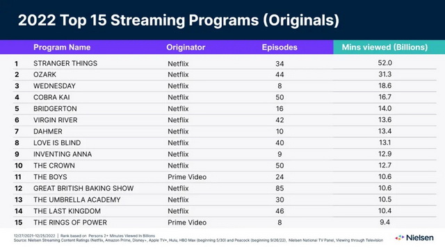 在尼尔森发布的2022年度原创剧集榜中,《指环王:力量之戒》第一季以94亿分钟排在第15名,刚好位居榜单末尾;这一数字甚至逊于同属亚马逊的《黑袍纠察队》,虽然后者录得的106亿分钟共涵盖24集,即为彼时已推出的前三季总计。