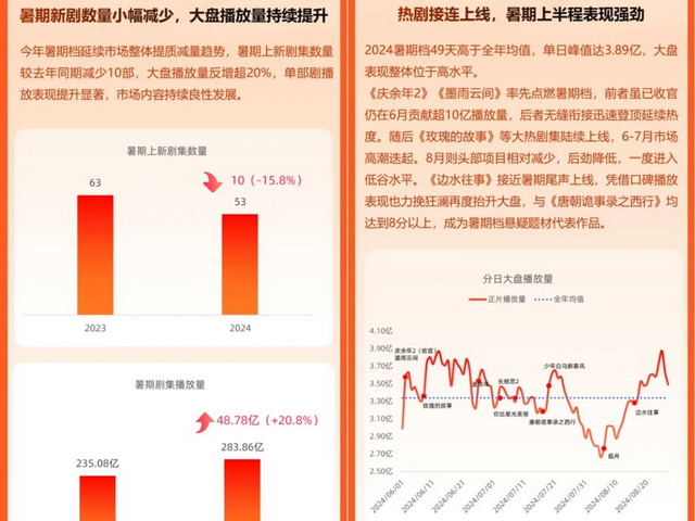 根据灯塔专业版,2024年暑期档(6-8月),剧集市场当中有49天高于全年均值,单日峰值达3.89亿,虽然剧集上新数量相比去年的63部减少了10部,但大盘播放量持续提升,较去年同期大盘播放量反超20%。