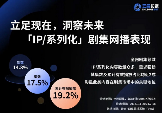 暑期档期间,云合数据也做出过IP/系列化作品的总结,自2017年以来,IP与系列化作品占据了总作品数的14.8%,总集数的17.5%,累计有效播放量达到了19.2%。而把范围缩小到2022年7月至今,《庆余年》两季更是实现了断层领先,《长相思》、“鬼吹灯”系列等也都有相当不俗的表现。