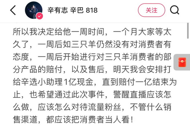 或许是观察到舆论难得对自己有利,9月4日晚,辛巴发布公告乘胜追击。首先,禁止辛选旗下直播间再带货大闸蟹品类,从而避免外界说他“蹭流量”。其次,祭出真正的“杀招”——给小杨哥一周的时间,如果“仍然没有对消费者有态度”,辛巴会自掏腰包1亿元替小杨哥给消费者赔付。