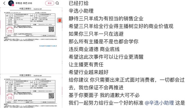 快手官方没有对外给出封禁时限或封禁理由,但辛巴即便不直播,也履行了对外界的承诺。不少网友在评论区晒出截图,表示收到了辛选集团的打款。