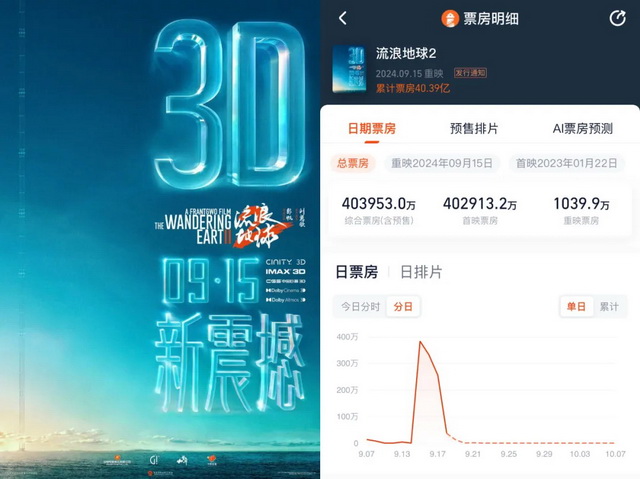 大家相对熟知的应该是《流浪地球2》的3D重制版,在中秋档共拿下了968.35万票房,排名档期第九。2D转制3D也是过去常见的重映逻辑,起码重映体验与首次上映之间形成了些许区隔。