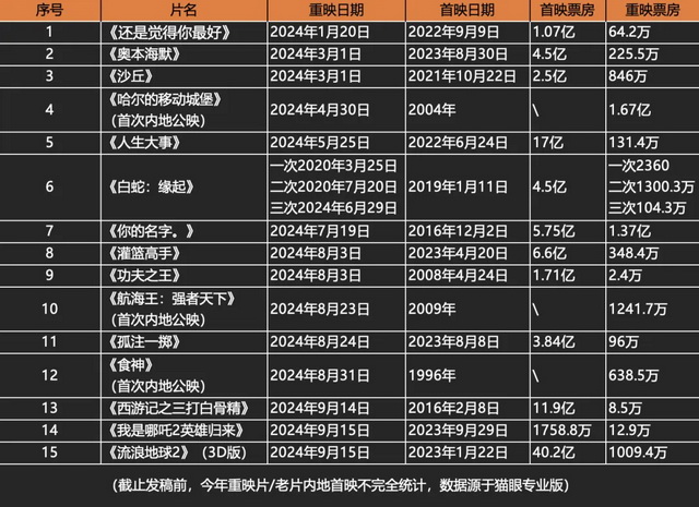 但重映片不能走向“凑数品”。由于去年中国电影市场存量几乎消耗殆尽,今年电影库存更加捉襟见肘,重映片相较上一年肉眼可见地多了起来,但效果也不尽如意。除了《你的名字》,《奥本海默》《沙丘》等重映片都没有破千万,《孤注一掷》连百万都不到,《功夫之王》只有2.3万,而这些作品在首映时都是过亿之作。