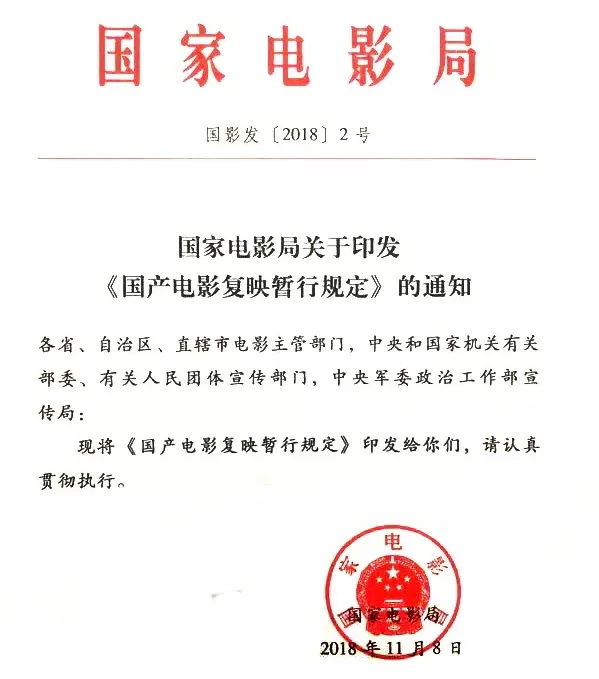 于是这一规定首先从时限上对复映片作出定义,即距首次公映结束超过两年再次进行发行放映的国产电影;其次强调电影复映应严格保护各版权相关方合法权益;第三规定复映片必须重审;最后限制复映影片上映范围不能超过2500家影院,每家影院只能有1个影厅排映。
