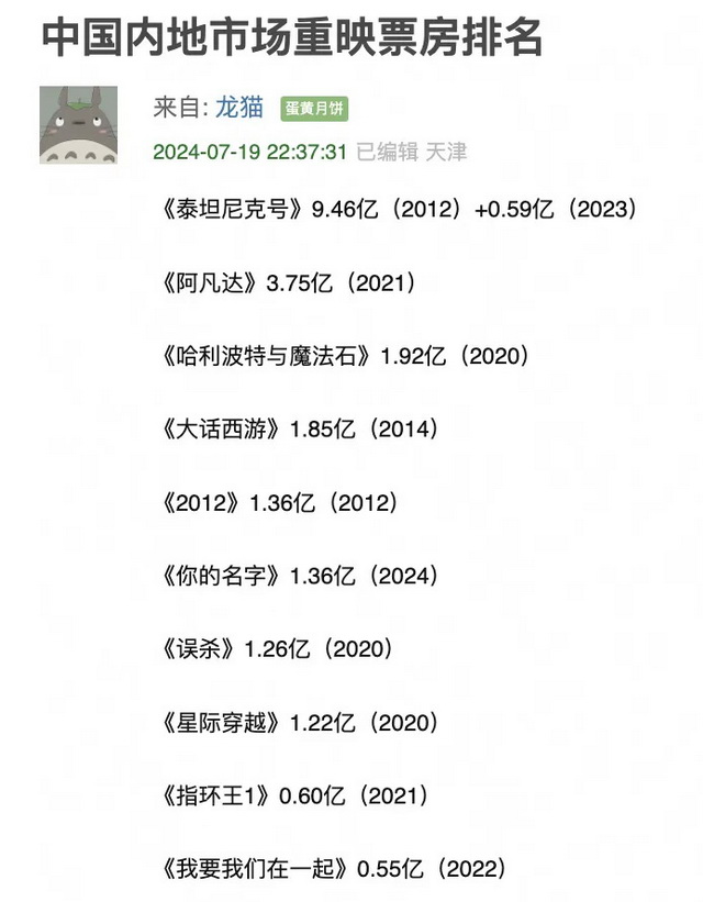 从商业价值来看,国内重映票房榜前十名,是《泰坦尼克号》《阿凡达》《哈利波特与魔法石》《大话西游》《2012》《你的名字》《误杀》《星际穿越》《指环王1》《我要我们在一起》,不外乎是有着全球影响力、视效突出的外国进口大片,或具有粉丝基础的日本动画电影、香港经典老片。