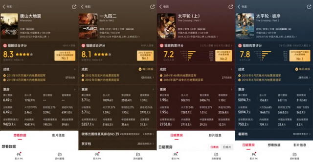 《唐山大地震》《一九四二》《太平轮(上)》《太平轮:彼岸》票房(数据来源:猫眼专业版)