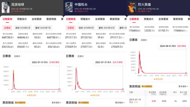 《流浪地球》《中国机长》《烈火英雄》票房(数据来源:猫眼专业版)