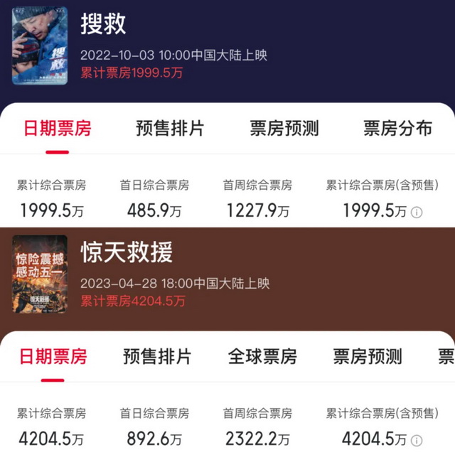 《搜救》《惊天救援》票房(数据来源:猫眼专业版)