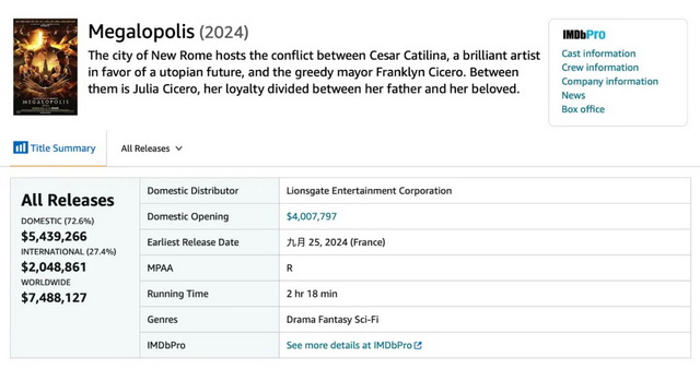 事实上,《大都会》是科波拉久违在北美大规模上映的导演作品,上一部还要追溯到2000年联合执导的《超级外星历险》,该片曾在2280家影院斩获673万美元,最终本土续航至1422万美元。