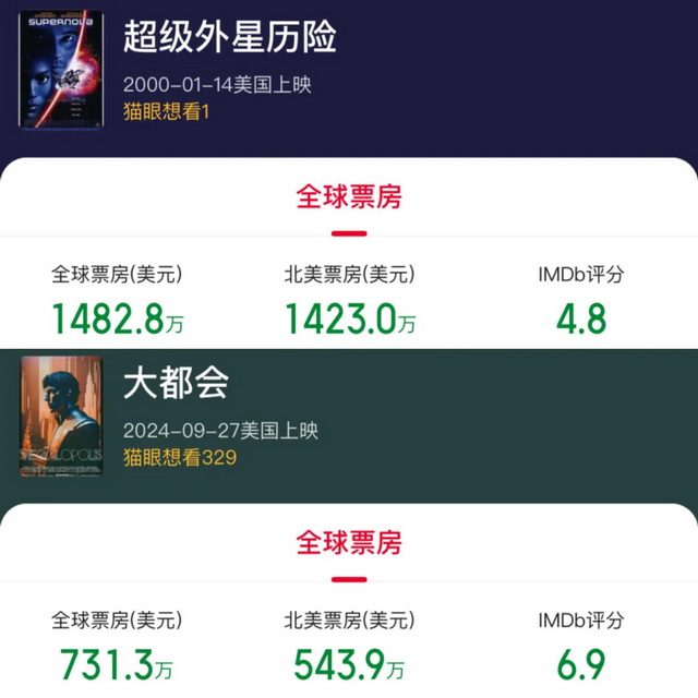 《超级外星历险》《大都会》票房(图源:猫眼专业版)