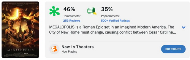 在北美,《大都会》首周末仅拿到401万美元,创下科波拉导演作品数十年来的最低值,而媒体和观众的口诛笔伐更是雪上加霜;即便《大都会》还有若干海外市场待映,但对比科波拉自掏腰包投入的上亿美元资金,院线端的收益并不足以填补巨额亏空,这部野心之作的命运恐怕不容乐观。