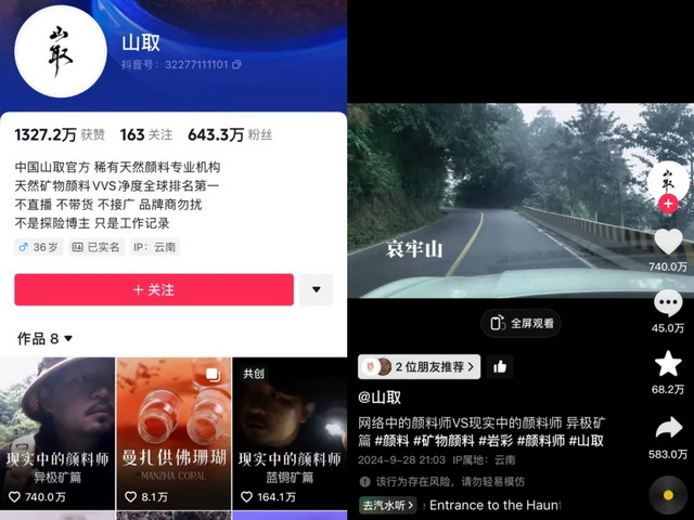 公开信息显示,“山取”是由云南山取画材有限公司运营的短视频账号,出镜的则是山取公司首席颜料师张俊杰,其抖音页面也标明“不是探险博主,只是生活记录”。其发布的十余支视频,基本都是探访各地寻找包括胭脂虫、火焰石、蓝铜、珊瑚等矿物颜料的内容。