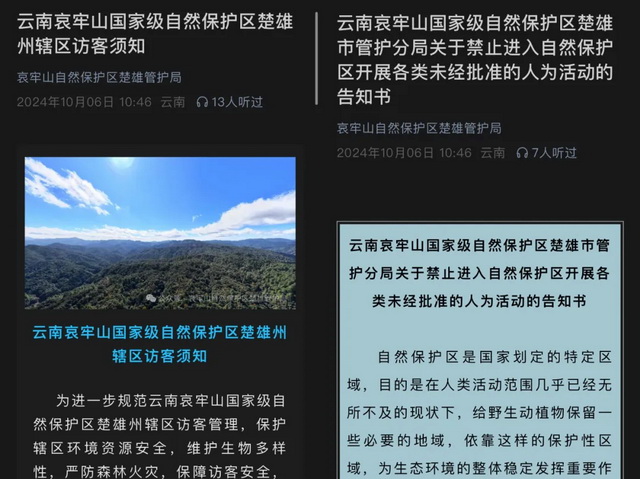 在游客扎堆涌进哀牢山后,10月6日,哀牢山自然保护区楚雄管护局发布《云南哀牢山国家级自然保护区楚雄州辖区访客须知》及《关于禁止进入自然保护区开展各类未经批准的人为活动的告知书》,其中明确:未经批准进入自然保护区或者在自然保护区内不服从管理机构管理的,由自然保护区管理机构责令其改正,并可以根据不同情节处以100元以上5000元以下的罚款。