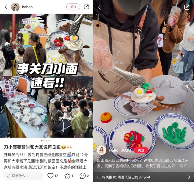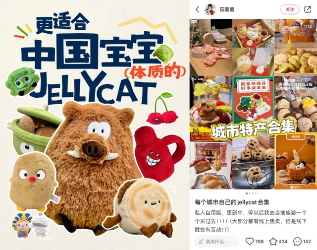 各地文创推出的类似拟人风玩具,价格相对亲民很多,被称为“平价版jELLYCAT”,因为带有城市文化特色也“更适合中国宝宝体质”,又因为门店出现了相似的“过家家”服务,不仅使这些文创在线上得到抢购,也引起不少人开始在线下打卡围观。
