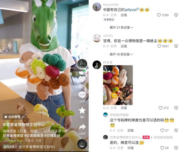 最早在6月4日,抖音@甘肃省博物馆文创中心就发布了“麻辣烫”这一文创新品,创意原型是年初因一条短视频跃升为“顶流”的甘肃天水麻辣烫。7月,#甘肃省博物馆卖麻辣烫了#的话题登上了微博热搜,博物馆卖的当然不是真麻辣烫,而是毛绒版麻辣烫菜品。