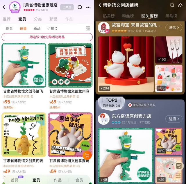 麻辣烫玩偶花束已售1w+,销售额仅次于最火的由镇馆之宝铜奔马开发的“绿马”玩偶挂件。在淘宝神店榜博物馆文创店铺榜里,甘肃省博物馆文创淘宝店“东方蜜语原创官方店”回头客排名第二,仅次于故宫淘宝旗舰店。