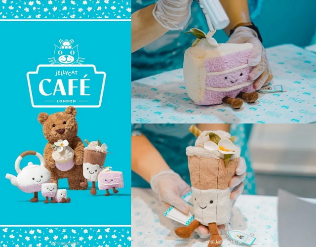 这种“过家家”模式,出现在去年9月。纽约玩具店FAO Schwarz与JELLYCAT合作,推出了首个“JELLYCAT Diner”体验店,提供各种食物形状的毛绒玩具,如羊角包、甜甜圈、爆米花,玩具餐厅正式开业。