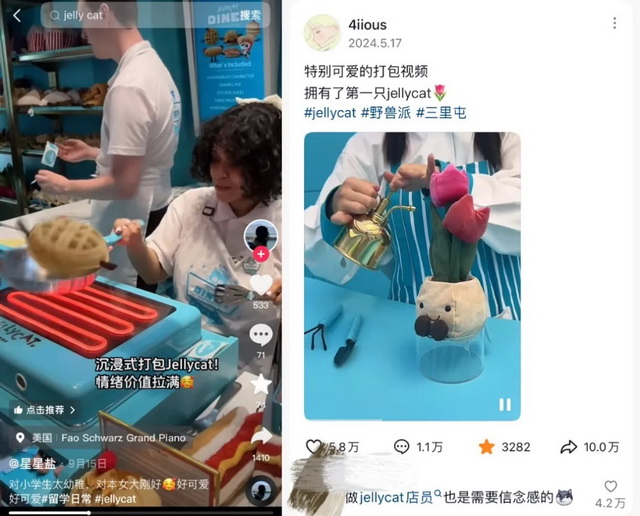 社交平台上,这些“过家家”打包视频都令人津津乐道。体验过的博主里,e人随地大小演,i人一边羞耻一边配合,最后不乏给出情绪价值拉满的肯定。国外版jELLYCAT打包视频则更疯狂,夸张的演技与超强信念感都给看客带来不少乐子。