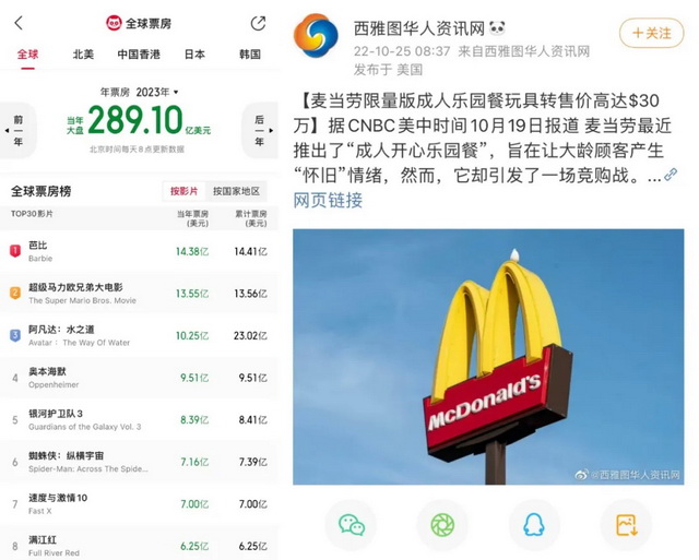 这几年,不乏现象级Kidult文化案例。比如去年的《芭比》,这不仅是去年全球票房第一的电影,更让芭比风回潮;前年,麦当劳推出的“限量版成人开心乐园餐”不光销量大涨,还让麦当劳客流量同比增长37%。