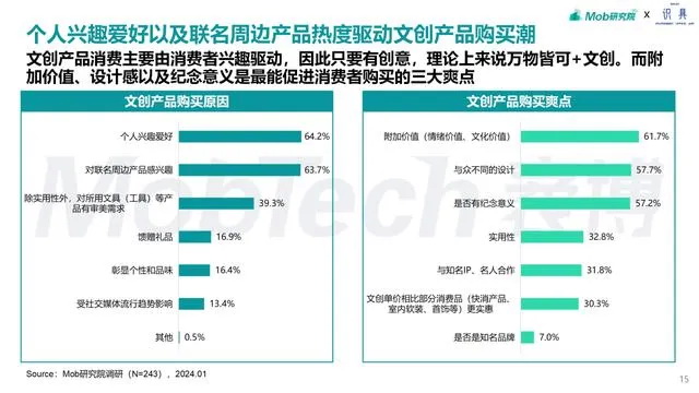 据Mob研究院《2024年文创行业报告》显示,文创产品消费主要由消费者兴趣驱动。附加价值、设计感以及纪念意义是最能促进消费者购买的三大爽点。