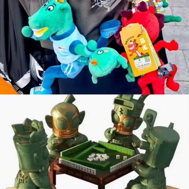 甘肃省博物馆打造龇牙咧嘴的丑萌“绿马”、三星堆博物馆则推出会打麻将的青铜小人,这些不同的趣味文创一一“整活文物”。
