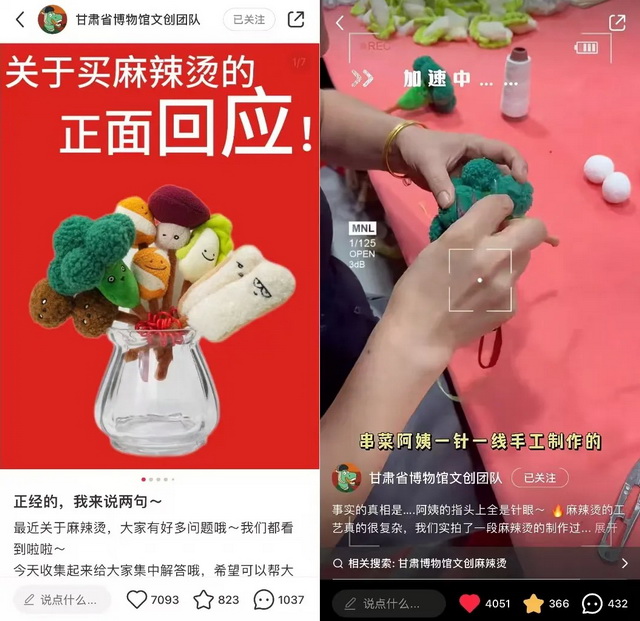 这一点,甘肃省博物馆就做得比较好,在甘肃麻辣烫文创缺货时,及时发布视频告知顾客“串菜”阿姨手工制作过程的不易,既安抚了顾客,又传递了工匠精神,收获了一波好感。