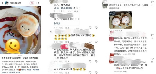 比如,保定驴肉火烧文创就因太像西安文创“绒馍馍”被吐槽,“花纹一摸一样,肉也不改,感觉直接加个驴耳朵就上架了”。由于驴肉火烧和肉夹馍本身比较像,创作之初,创作团队也担心被人说抄袭,但最后的成品还是让部分保定人看了也感到“尴尬”。