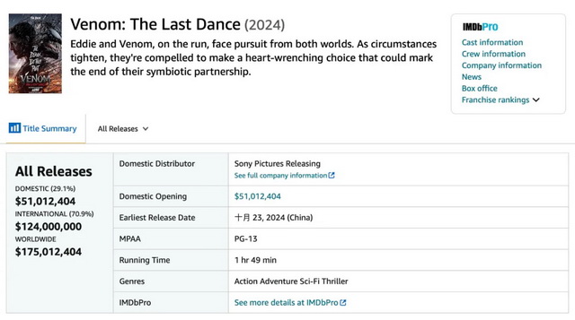 所幸《毒液3》在海外市场发挥不俗,基本达到索尼映前的期待值。据Comscore统计,《毒液3》共进军65个国家和地区,北美之外的收益为1.24亿美元,与本土合计则达到1.75亿美元。