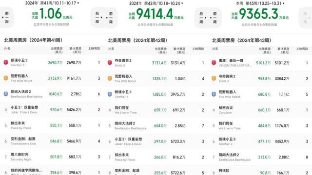 受到《毒液3》等片的驱动,北美周末大盘上涨36.6%至9375万美元,结束此前连续三周下滑的趋势,但近两个月未破亿的纪录还在延续。截至10月19日,北美年度总票房终于突破65亿美元,去年则在8月底便已撞线,用时足足多出54天。