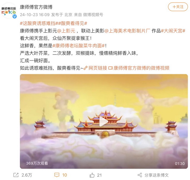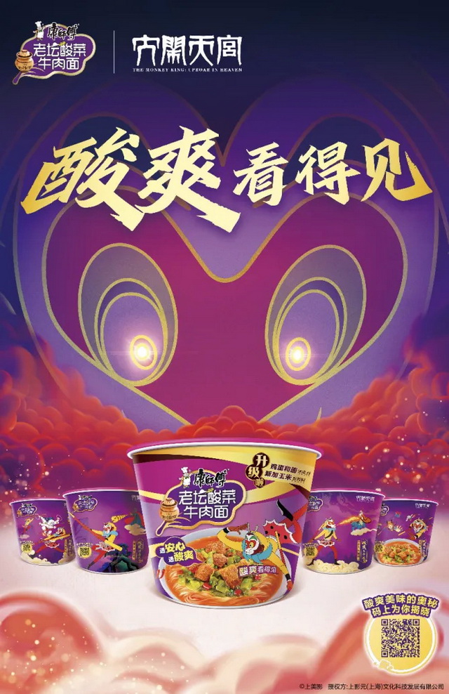 《大闹天宫》60周年的沉淀与康师傅经典款老坛酸菜牛肉面的历久弥新,既是经典与经典的强强联合,也是康师傅携手上影元,联动上美影在各自领域的深厚积淀与现代营销策略的巧妙结合。