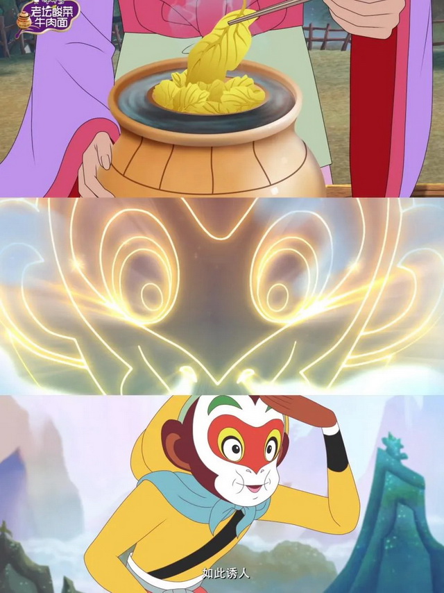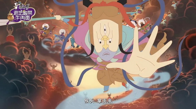 在双方激战正酣时,康师傅老坛酸菜牛肉面的香味飘散开来,悟空立刻被吸引,飞身而下。太上老君、托塔天王、哪吒、二郎神也被难挡的酸爽香味而诱惑,二郎神更是率先冲出,高呼“猴头,拿面来”。