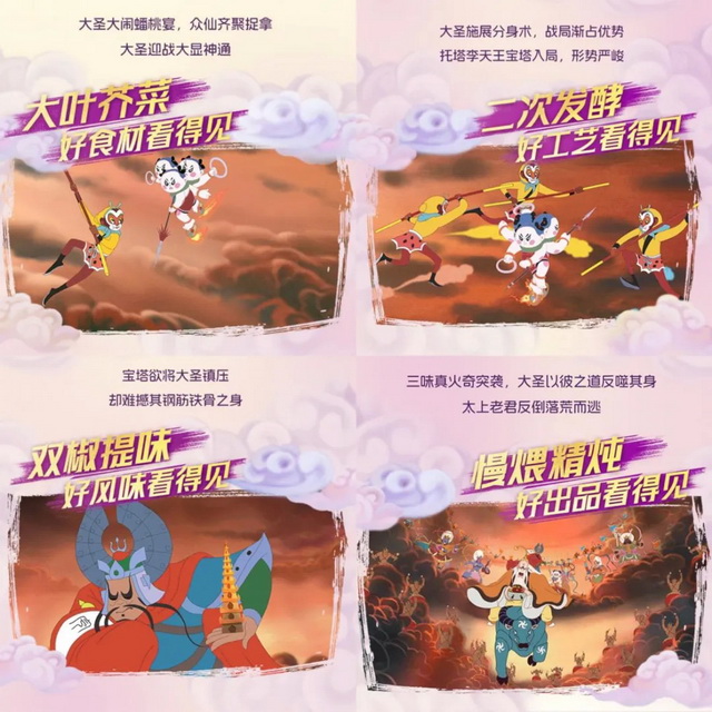 令人惊喜的是,这一传播效应还影响到了泡面圈。近日,国民品牌康师傅推出了《大闹天宫》联名款老坛酸菜牛肉面,并发布了一部联名TVC短片。有网友直呼“最喜欢的人物和最爱吃的泡面联名了”。