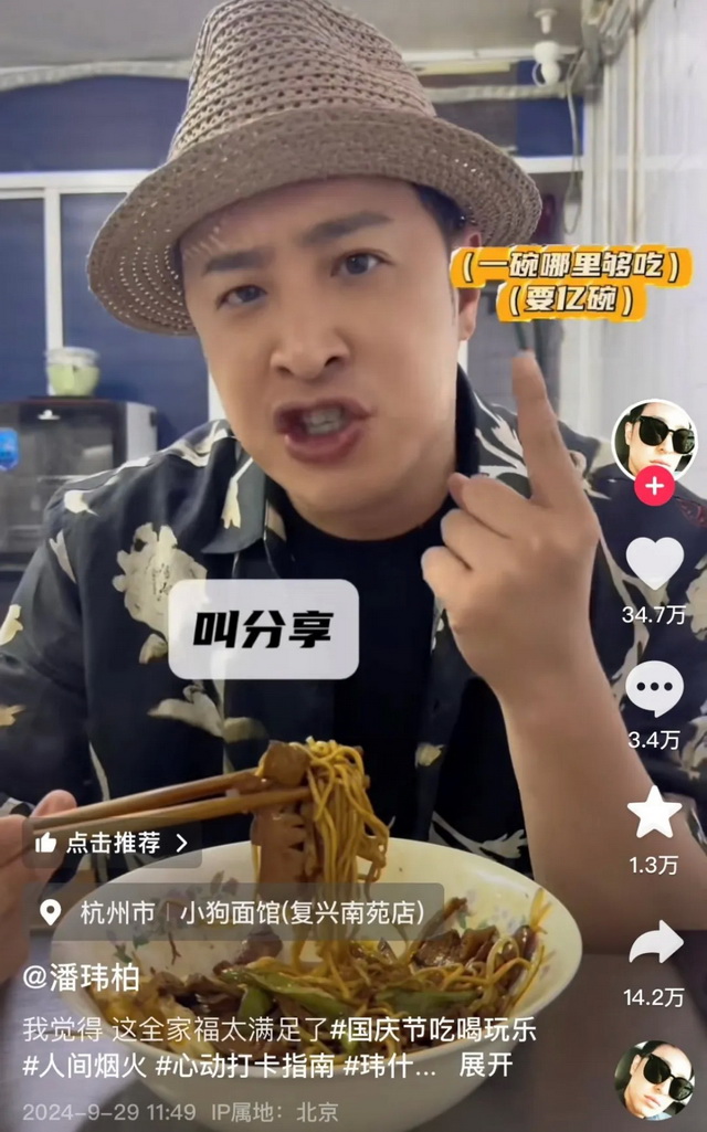 比如潘玮柏一人吃完双人份两大碗的全家福拌面后,网友为其起绰号“潘胃伯”,全国各地的网友还在其抖音评论区推荐当地经典面食,评论区秒变大型美食种草区。