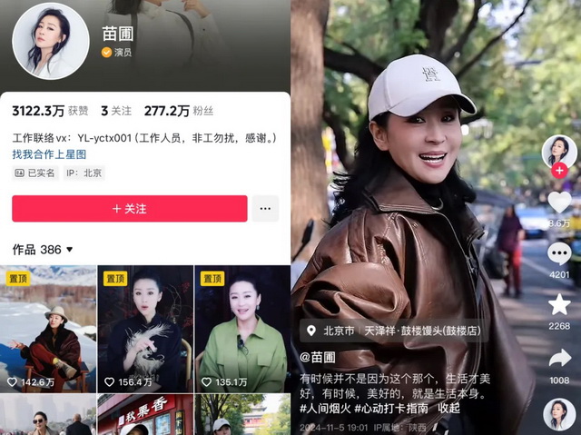 表现比较明显的演员苗圃的抖音账号。在发布探店视频前,苗圃的抖音视频多以女性成长,日常记录为主,这些视频点赞基本在1万左右。今年10月,苗圃开始自己的探店之旅,先后在北京天泽祥·鼓楼馒头、秋栗香打卡,拍摄视频,其中探店天泽祥·鼓楼馒头的视频点赞近十万,是苗圃最近数据表现最好的一支视频。