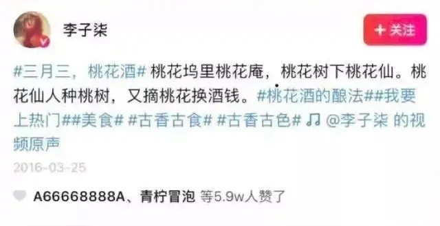 2015年前后,李子柒自称m哥,在美拍上拍摄搞怪视频来为淘宝店引流,只不过既没有激起什么水花也与她的性格不符,不久之后,她视频的重心开始转向自己的生活。转年春天,她的一则《桃花酒》视频被大范围转发和推荐,在美拍工作人员的建议下她决定改名,那个曾经沉睡在记忆深处的QQ空间名字被她打捞起来,自此李子柒登场。当时没人能想到,这个名字未来会成为宏大叙事的一环,被赋予超过她本身的意义。
