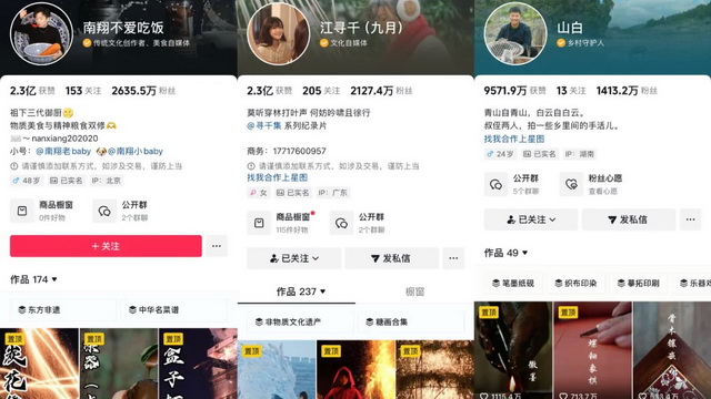 曾经独属于李子柒的赛道,如今也已经人满为患,比如南翔不爱吃饭、江寻千(九月)、归乡人山白等等,他们的账号粉丝均在千万级别。在最近接受媒体采访时,面对“是否担心观众审美发生变化”的提问,李子柒表示,传统文化像极了一位垂暮的老人,“今天因为有了更多的传统文化的手艺人,以及我们做传统文化的自媒体们的加入,那位老人真的有在不断地被看见和被喜欢。这是整个社会参与的结果,如果只是我一个人不可能会形成今天这样的局面的。”